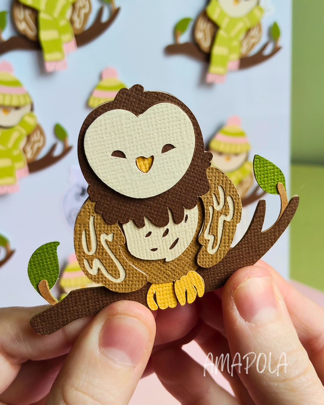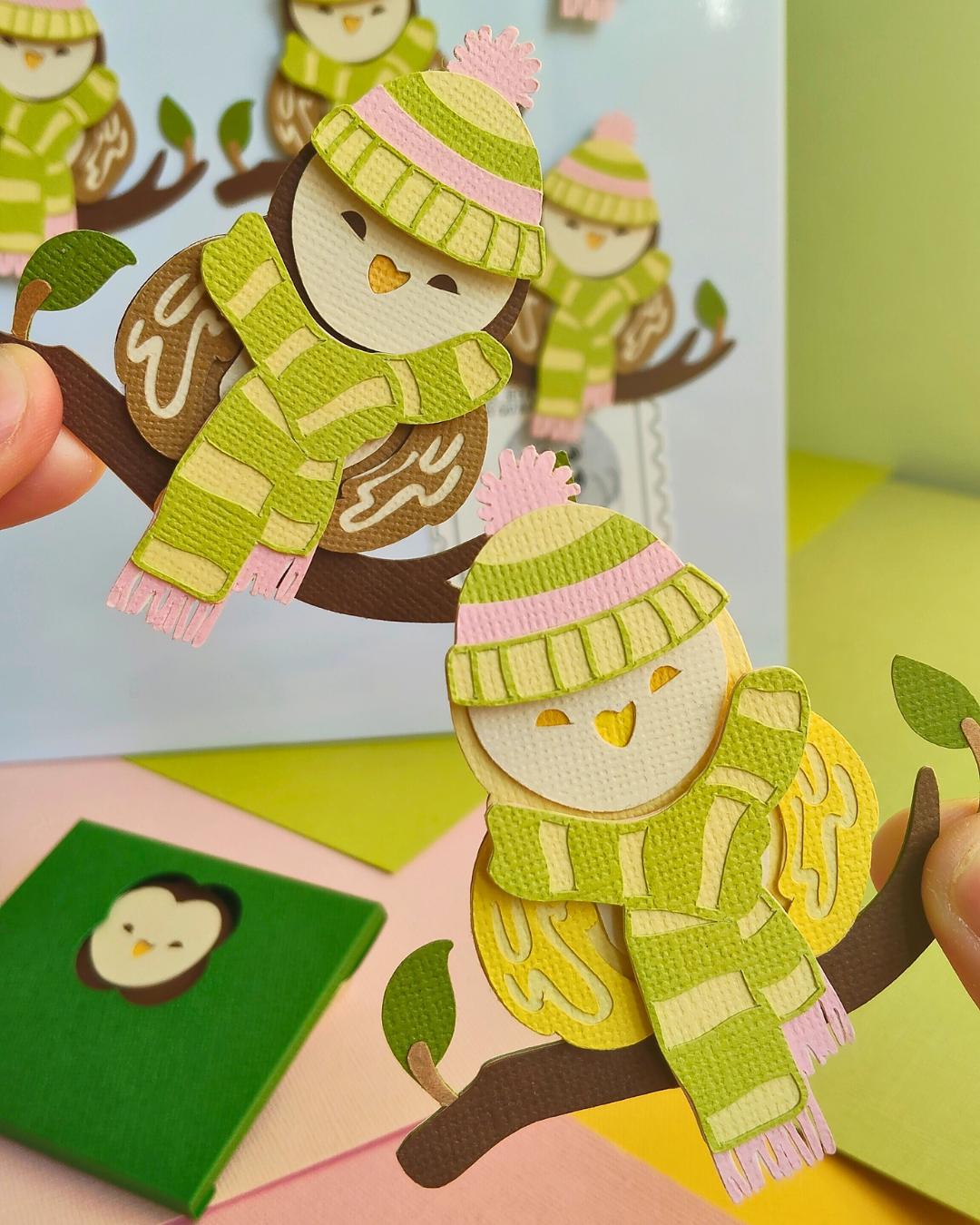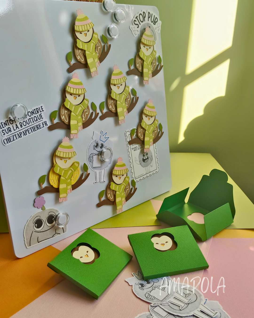 Cette chouette est composée de 14 couches de papier découpé et assemblé à la main pour un joli relief. En plus, tu peux personnaliser ta chouette avec un bonnet (7 couches) et une écharpe (4 couches), tous deux aimantés, que tu peux fixer facilement sur ta chouette pour lui donner encore plus de style !