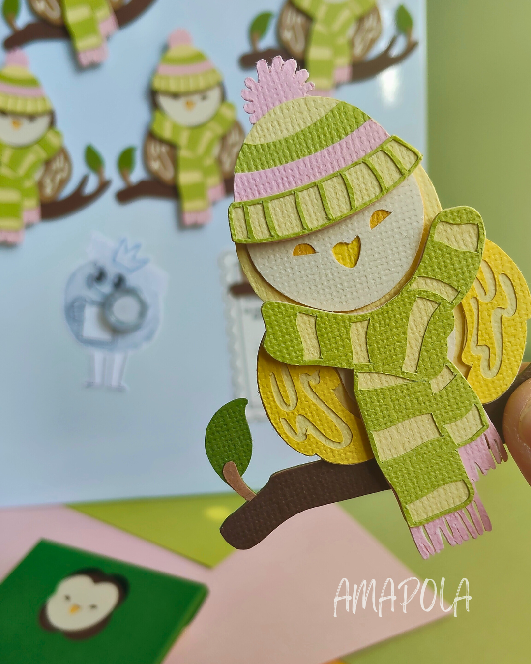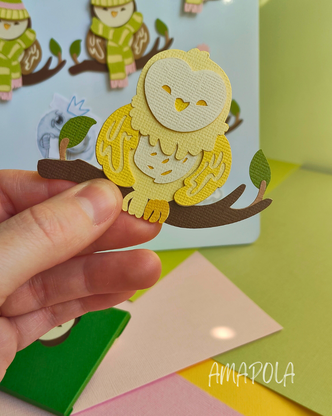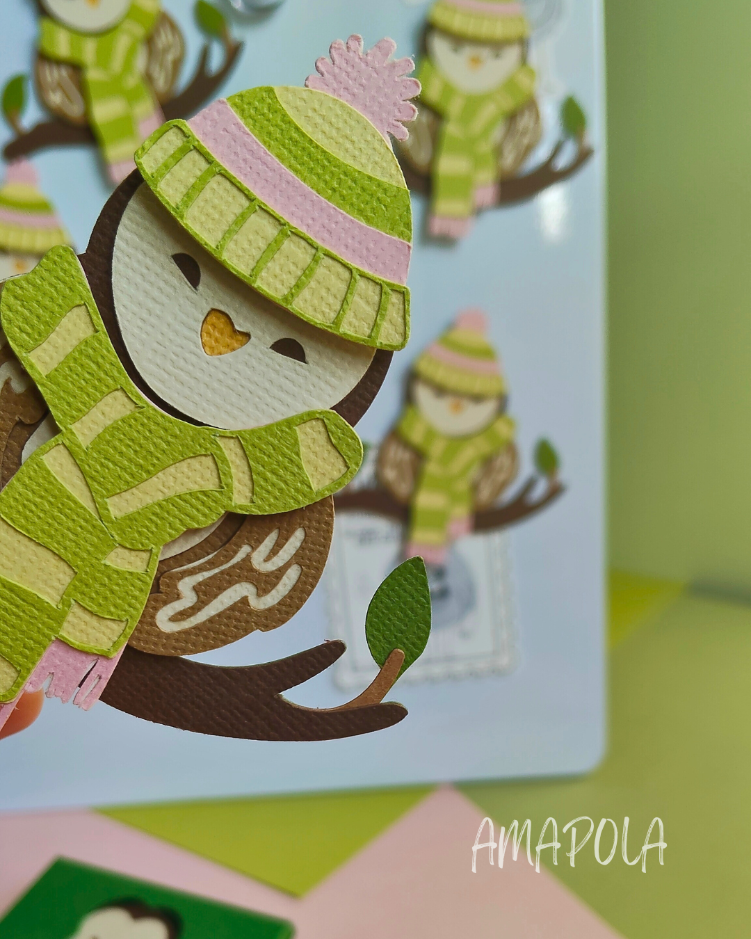Cette chouette est composée de 14 couches de papier découpé et assemblé à la main pour un joli relief. En plus, tu peux personnaliser ta chouette avec un bonnet (7 couches) et une écharpe (4 couches), tous deux aimantés, que tu peux fixer facilement sur ta chouette pour lui donner encore plus de style !