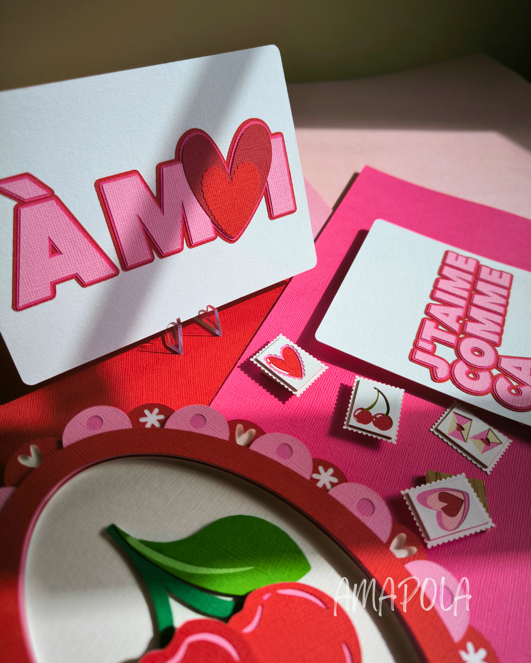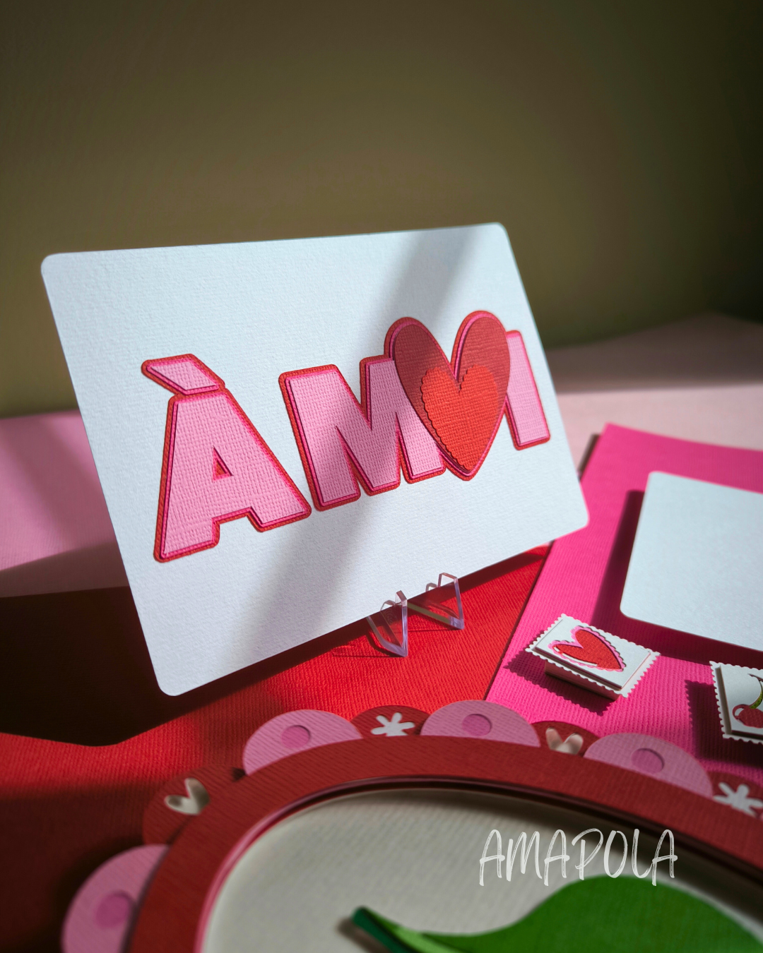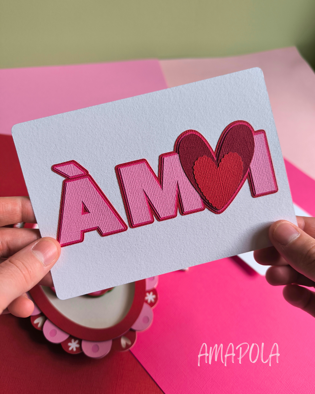 Chez Amapola, chaque carte est bien plus qu’un morceau de papier : c’est un petit manifeste. Ici, le mot « À MOI » est mis en volume avec du papier découpé multicouche, et un cœur vient remplacer le « O » avec un relief aussi doux que symbolique. Une déclaration d’amour (ou d’amour-propre) en lettres capitales, littéralement.