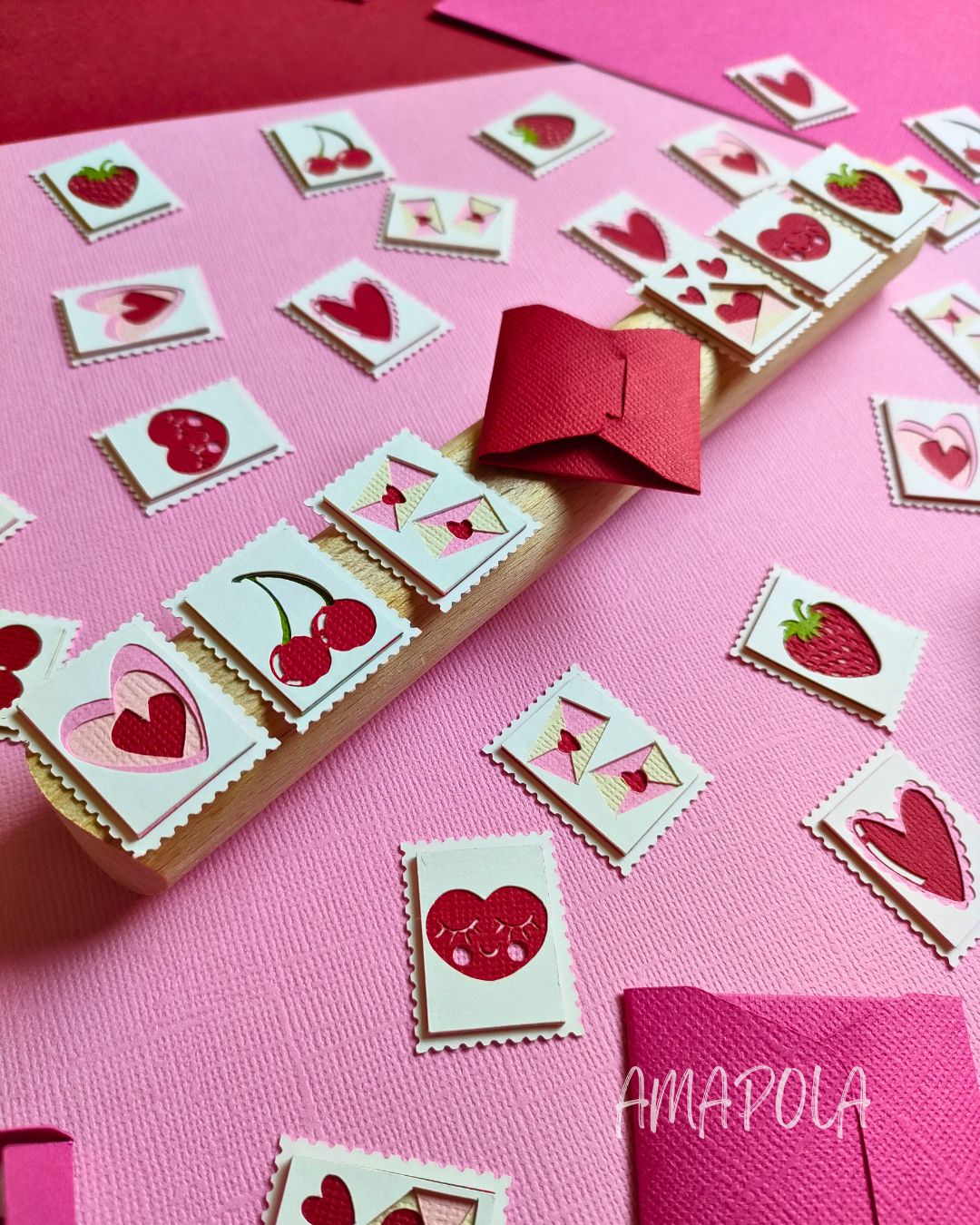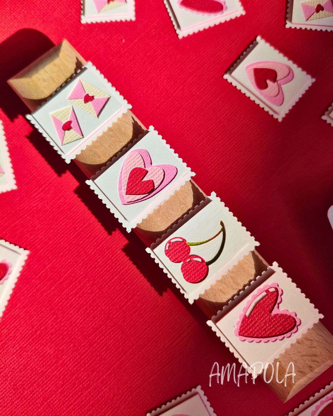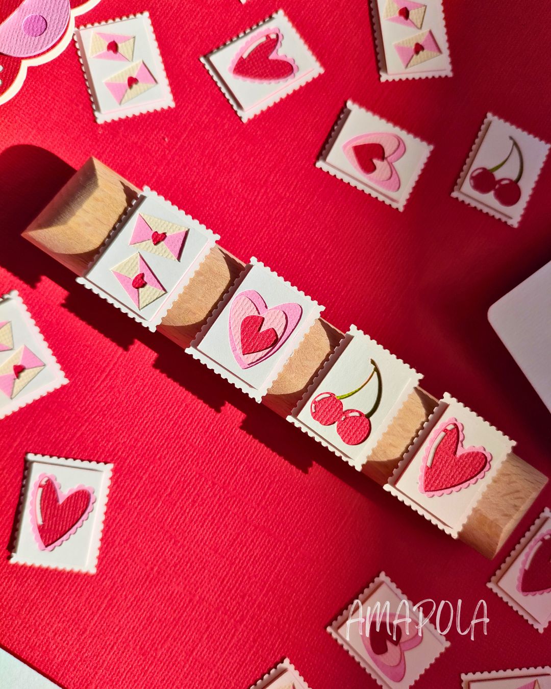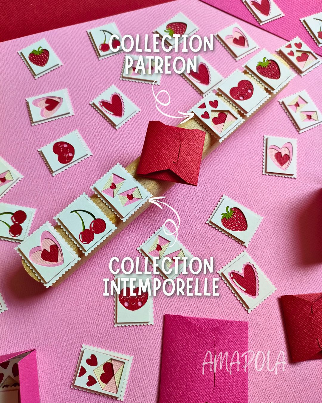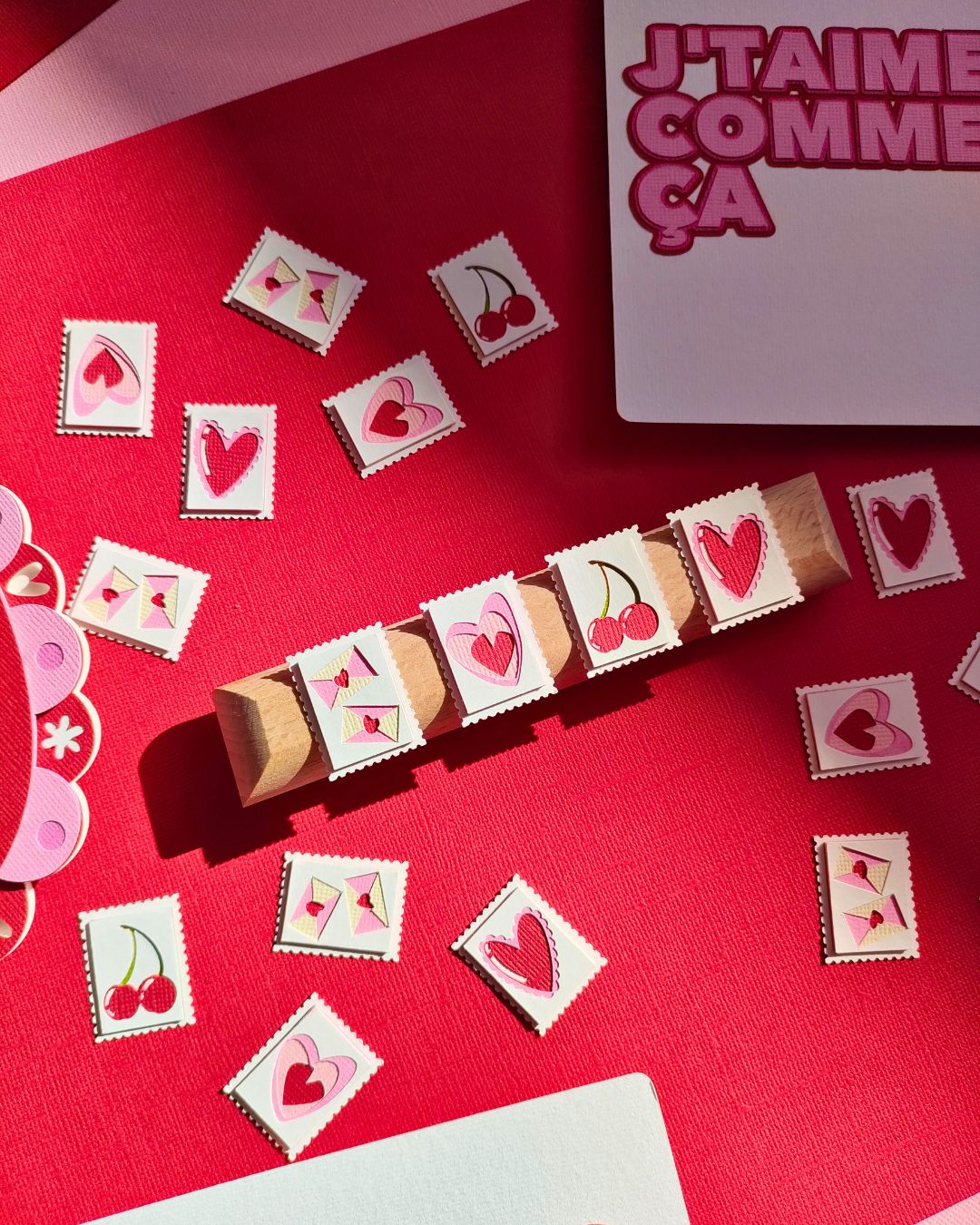 Un concentré de tendresse et de légèreté, composé de 4 timbres illustrant chacun une facette de l’amour (et du papier découpé, évidemment) : Une paire d’enveloppes fermées par un cœur – parce que l’amour passe toujours par un mot doux // Un triple cœur qui s’emboîte – comme les sentiments, un peu en vrac mais bien collés // Une paire de cerises – duo inséparable et sucré, clin d’œil aux amoureux // Un cœur froufroutant – romantique à souhait, un brin vintage, 100 % charmant.
