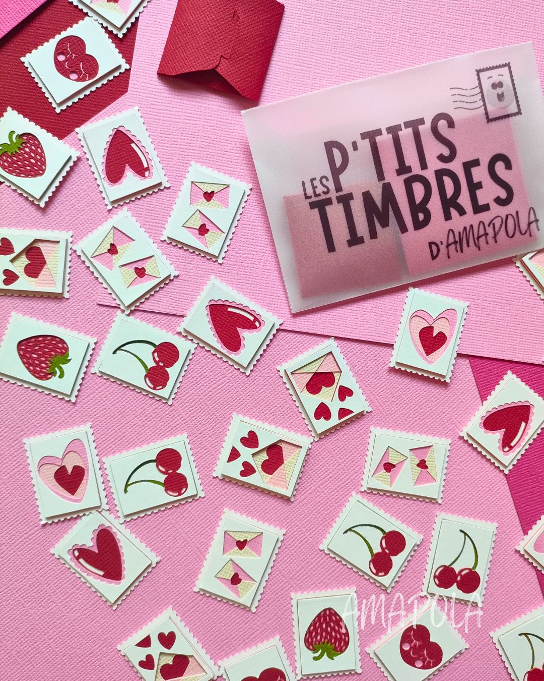 Sur les photos, les timbres sont lovés dans de jolies pochettes rouges… mais la couleur que vous recevrez pourra varier selon les stocks, pour une surprise à chaque commande !