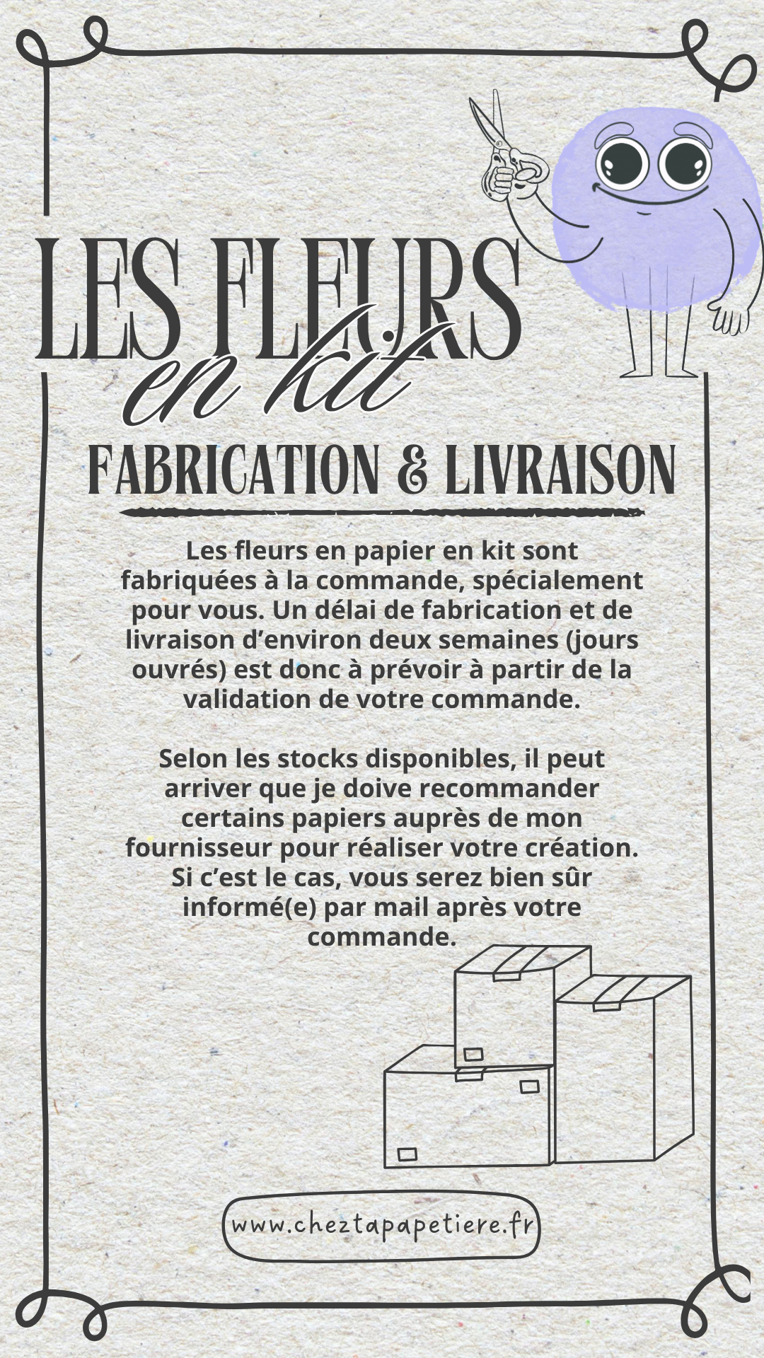 Les fleurs en papier en kit sont fabriquées à la commande, spécialement pour vous. Un délai de fabrication et de livraison d’environ deux semaines (jours ouvrés) est donc à prévoir à partir de la validation de votre commande.